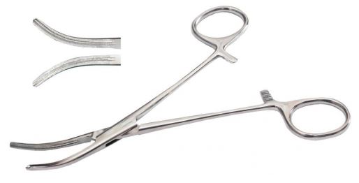 Зажим кровоостанавливающий, атравматический, изогнутый. Инструмент предназначен для пережатия кровеносных сосудов с целью временной остановки кровотечения; зажимы кровоостанавливающие имеют рабочие губки с мелкой насечкой и конической наружной поверхностью. Длина 160 мм, длина рабочей части 35 мм.
