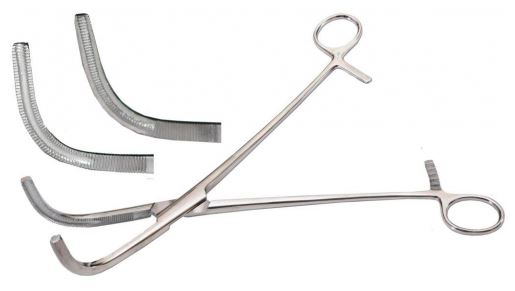 Зажим жесткий, для влагалищных операций, изогнутый, №2, 233 мм. Длина рабочей части 80 мм. Инструмент предназначен для остановки маточного кровотечения в раннем послеродовом периоде.