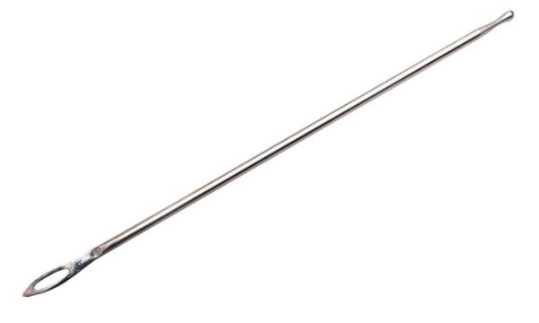 Зонд пуговчатый с ушком, 160 мм. Длина 160 мм, ширина рабочей части 3 мм. Предназначен для исследования каналов и полостей в тканях и органах, для введения тампонов в рану и проведения лигатур.